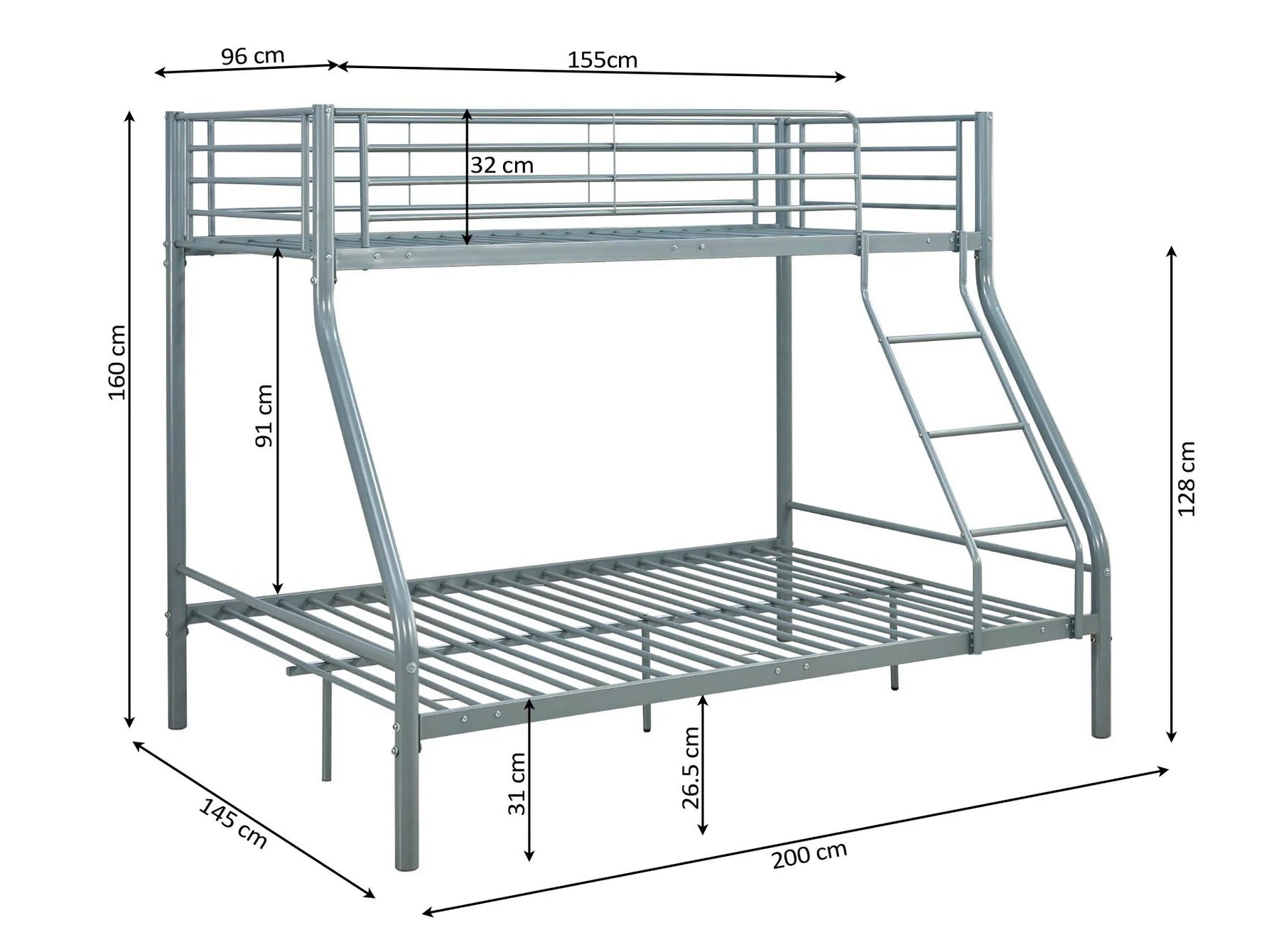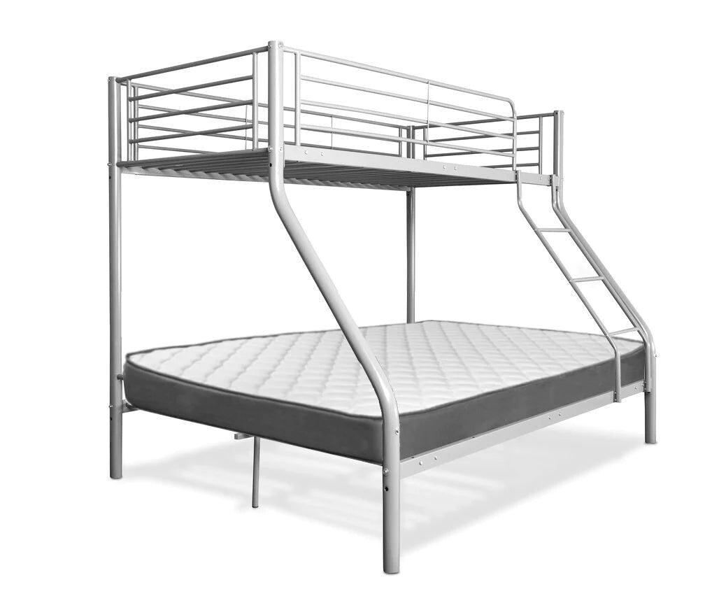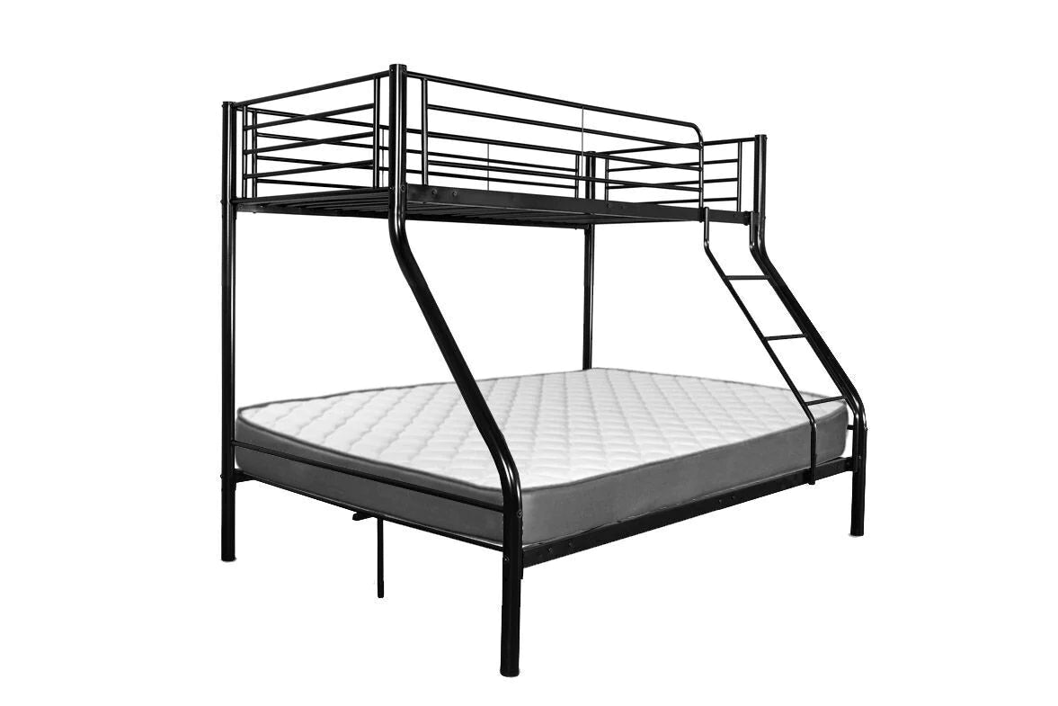 Litera doble con una estructura metálica con cama de matrimonio abajo e individual arriba. Esta litera es perfecta para espacios reducidos y se adecua perfectamente a cualquier estilo de decoración. Marco de metal resistente, seguro y duradero que proporciona comodidad y apoyo necesarios.