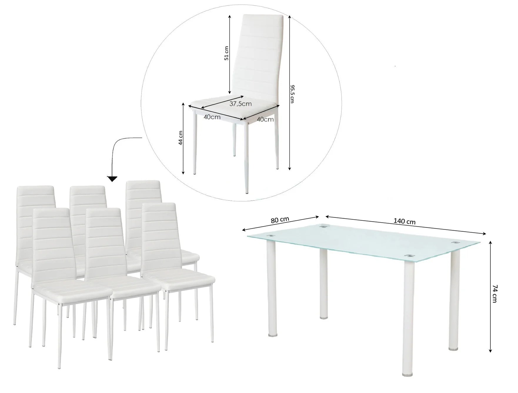 Las 6 sillas a juego son el complemento perfecto para la mesa. Tienen una estructura de acero resistente y un acolchado suave para garantizar una experiencia comoda al sentarse. Ademas, se ajustan perfectamente a la mesa, lo que garantiza una estetica uniforme en el conjunto de la sala de comedor. Facil montaje.
