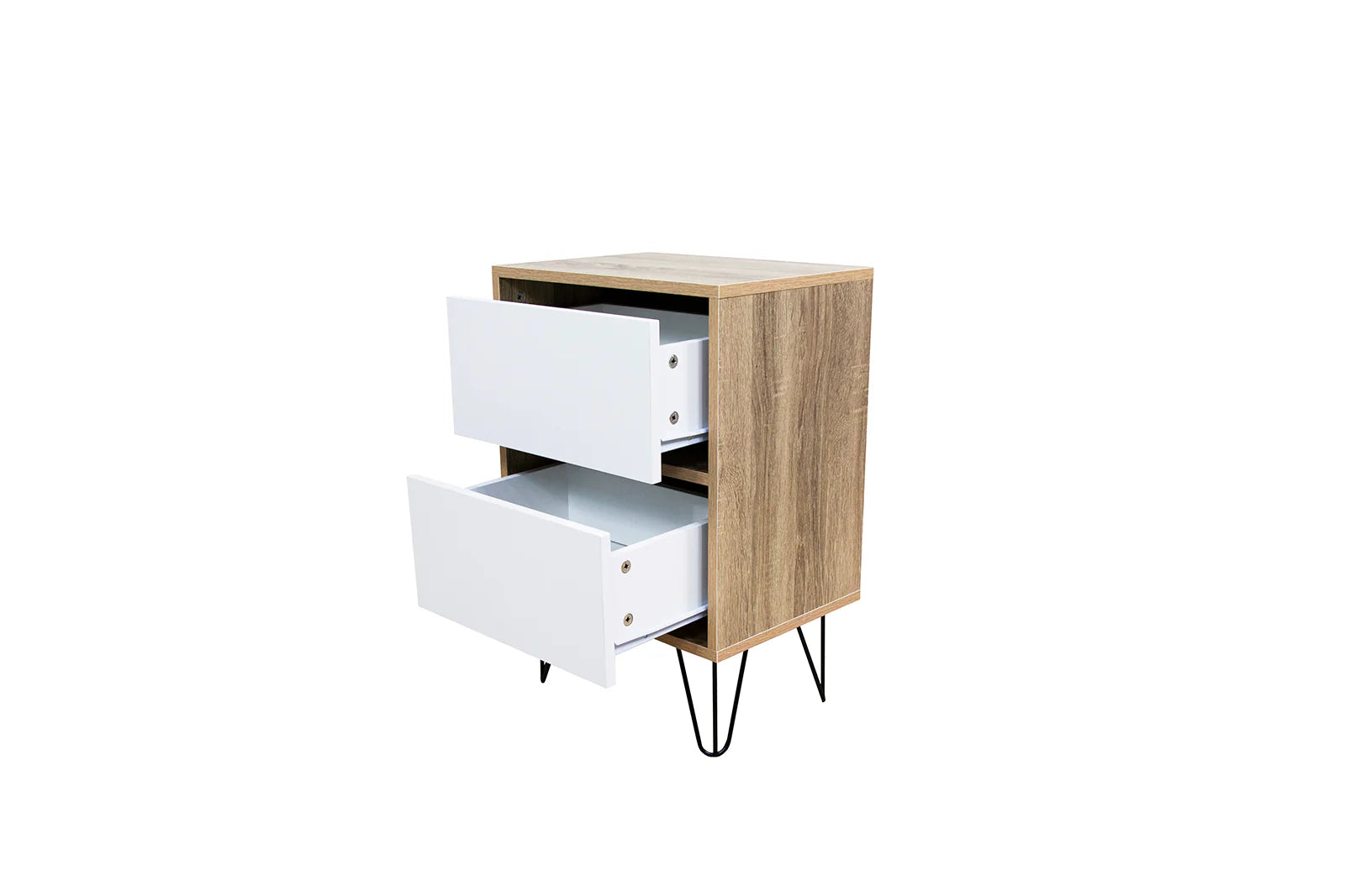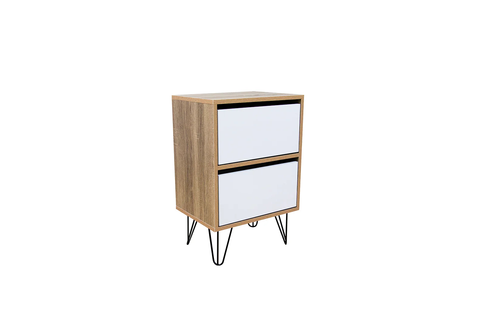 Combina estilo y funcionalidad en tu dormitorio con nuestra moderna y elegante mesita de noche. Con su diseño contemporaneo, esta mesita es la compañera perfecta para tu cama, proporcionando almacenamiento practico y un toque de sofisticacion. Los dos cajones espaciosos de la mesita de noche te ofrecen un espacio de almacenamiento adicional para tener tus articulos personales organizados y al alcance de la mano. El acabado en blanco cambria le da un toque de luminosidad y frescura a la mesita, mientras que las patas metalicas negras le confieren un aspecto moderno y elegante. Su diseño compacto y versatil tambien la convierte en una opcion perfecta para otros espacios de la casa, como el salon o la sala de estar. Facil montaje.