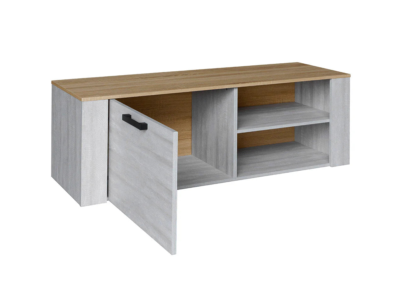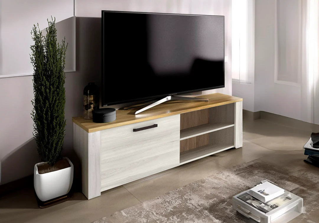 Añade elegancia y funcionalidad a tu sala de estar con nuestro Mueble TV en color Fines y Milano. Este mueble combina un diseño contemporáneo con una estructura robusta, ofreciendo una solución práctica y estilosa para tu entretenimiento. Cuenta con una puerta que oculta un amplio espacio de almacenamiento, perfecto para mantener tus dispositivos y accesorios organizados y fuera de la vista. Los dos huecos abiertos son ideales para colocar tu decodificador, consola de juegos u otros equipos electrónicos. Facil montaje.