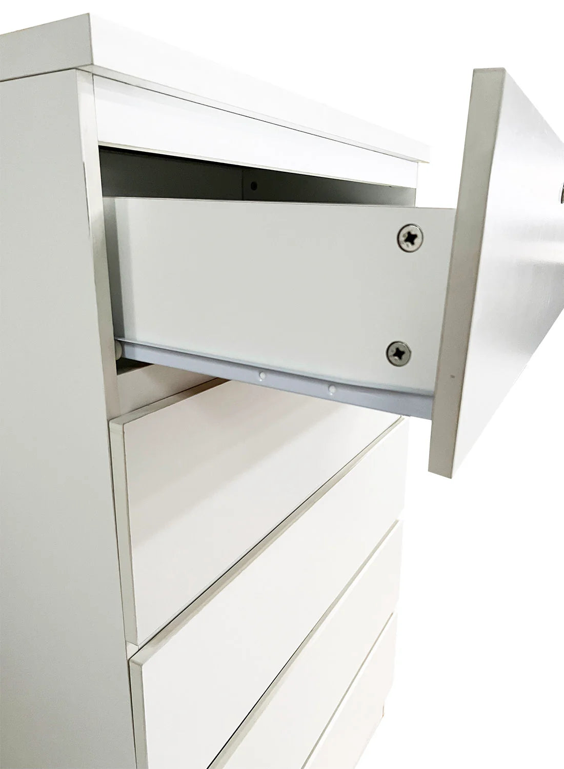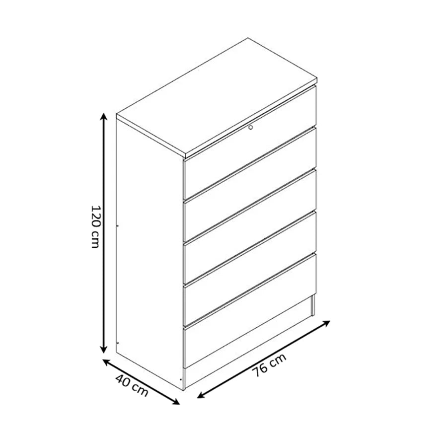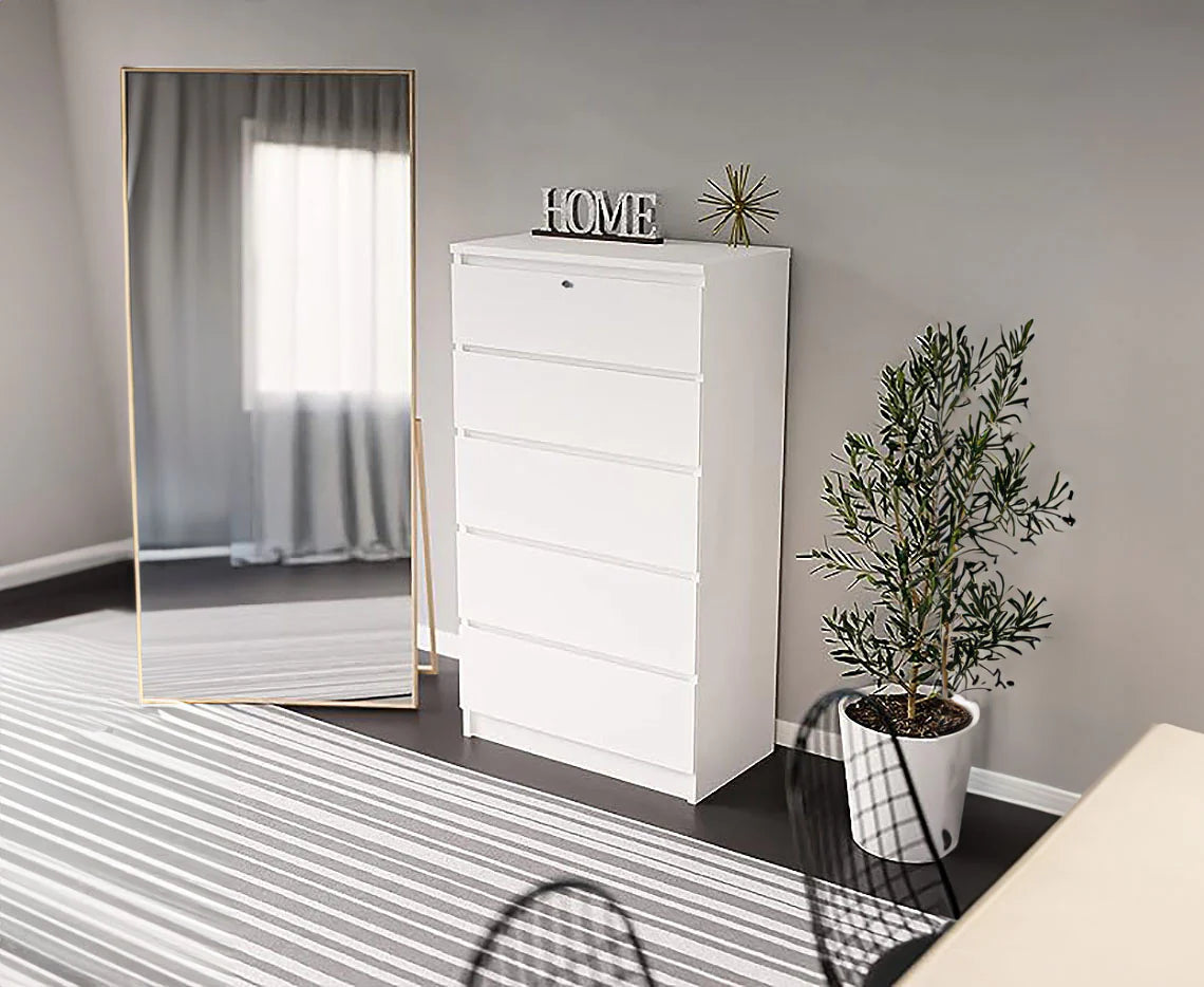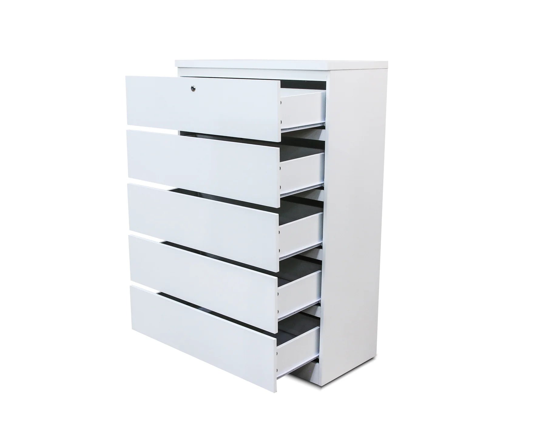Con su diseño moderno y acabado en blanco, este sinfonier se adapta perfectamente a cualquier estilo de decoración. Los cinco cajones proporcionan un amplio espacio para guardar ropa, accesorios y objetos personales, mientras que el cajón con llave ofrece una opción segura para artículos valiosos. Facil montaje.