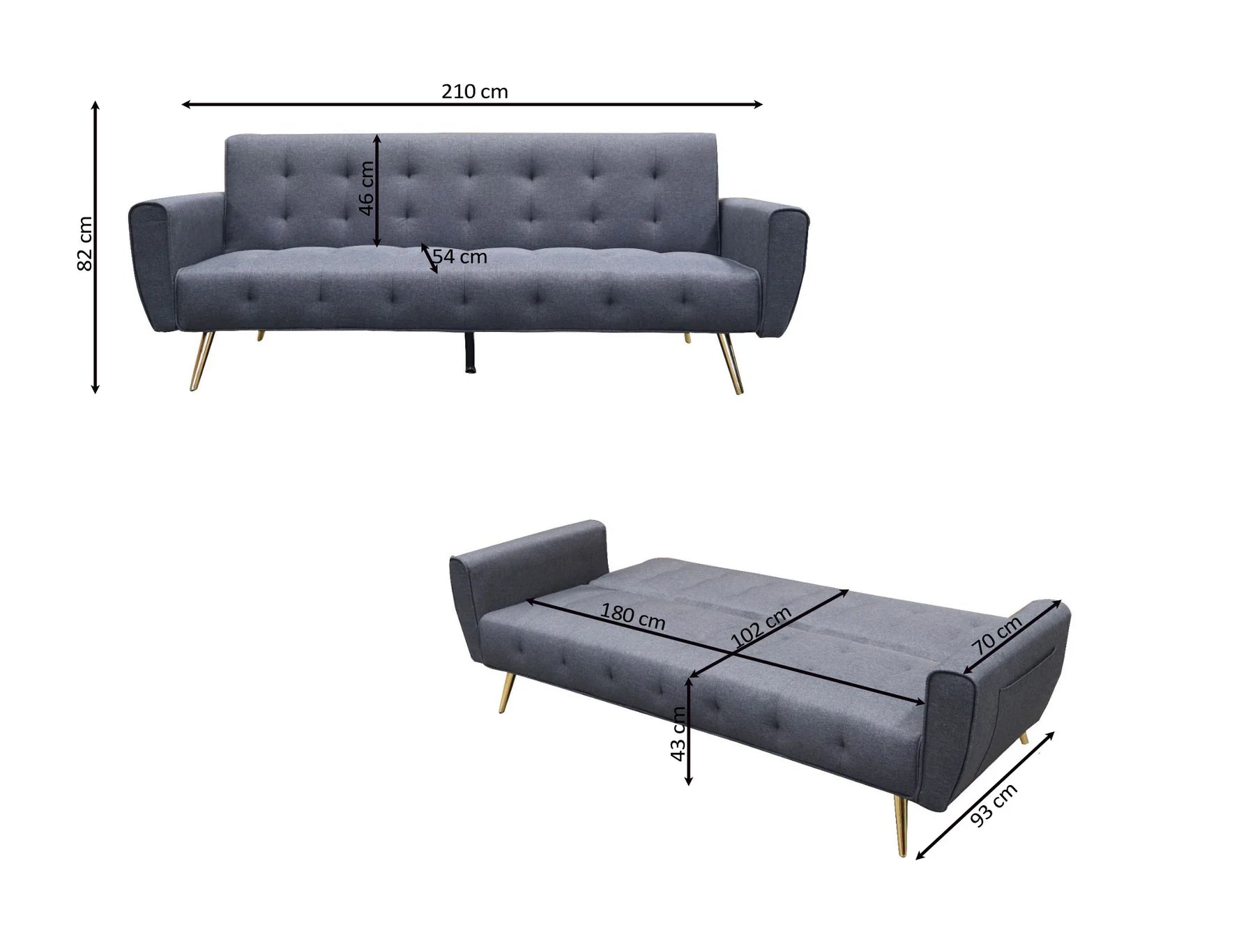 Fabricado con materiales de alta calidad y cuenta con un diseño moderno y elegante que se adapta a cualquier estilo de decoracion. Su estructura es solida, robusta y sobre todo duradera, con patas metalicas oblicuas que garantizan una maxima estabilidad. Este Sofa Cama Barato sera el complemento perfecto para tu espacio. Facil montaje.